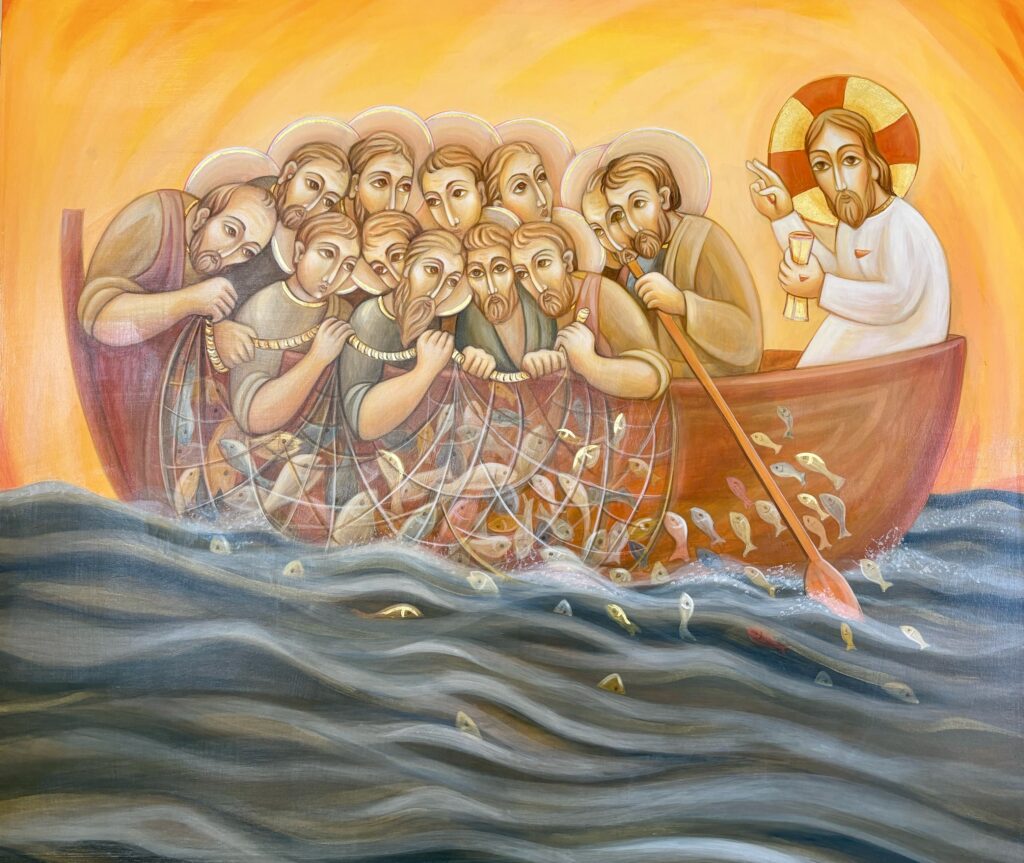 And it came to pass, that, as the people pressed on him to hear the word of God, he stood by the lake of Gennesaret, and saw two ships standing by the lake: but the fishermen were gone out of them, and were washing their nets. And he entered into one of the ships, which was Simon’s, and prayed him that he would thrust out a little from the land. And he sat down, and taught the people out of the ship. Now when he had left speaking, he said to Simon, Launch out into the deep, and let down your nets for a draught. And Simon answering said to him, Master, we have toiled all the night, and have taken nothing: nevertheless at your word I will let down the net. And when they had this done, they enclosed a great multitude of fishes: and their net broke. And they beckoned to their partners, which were in the other ship, that they should come and help them. And they came, and filled both the ships, so that they began to sink. When Simon Peter saw it, he fell down at Jesus‘ knees, saying, Depart from me; for I am a sinful man, O Lord. For he was astonished, and all that were with him, at the draught of the fishes which they had taken: and so was also James, and John, the sons of Zebedee, which were partners with Simon. And Jesus said to Simon, Fear not; from now on you shall catch men. And when they had brought their ships to land, they forsook all, and followed him.